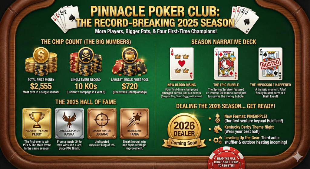 Welcome to The Pinnacle Poker Club’s third annual Friends & Family Tournament Series! Below are details about the tournaments, the scoring, and the awards that we are all playing for.